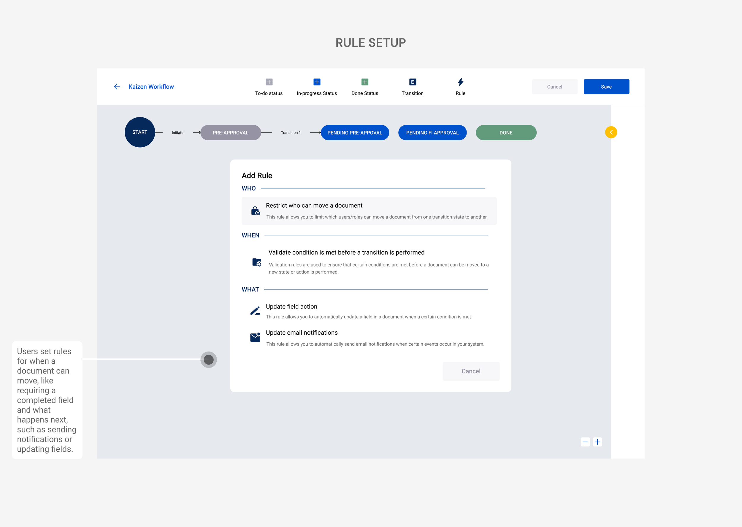 In the first version, I focused on making it easy for users to build workflow rules by starting with what they wanted the system to do.